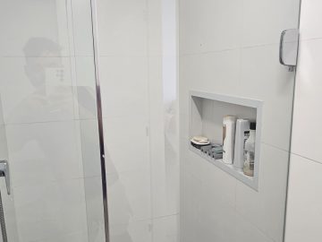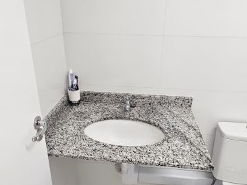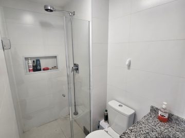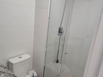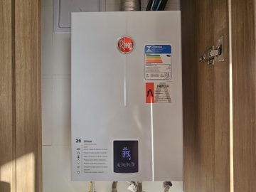 Aquecedor a gás 26L da marca Rheem e duchas Docol TechnoShower com monocomandos nos banheiros.
