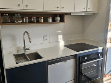 Pedra da cozinha em Quartzo Branco com cooktop por indução e forno elétrico da marca Electrolux.