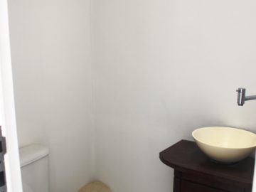 Lavabo, sala de jantar ampla conectada à sala de estar;
