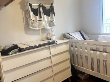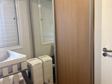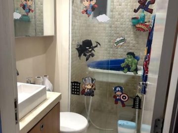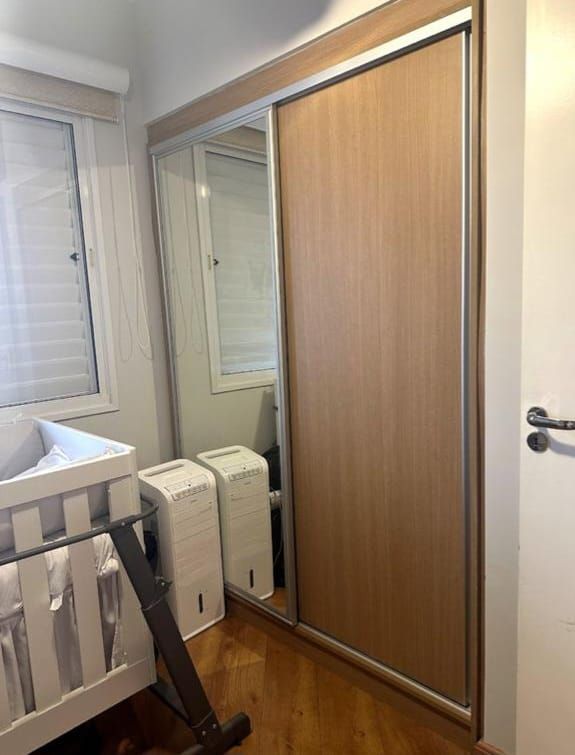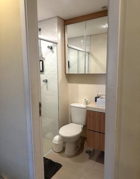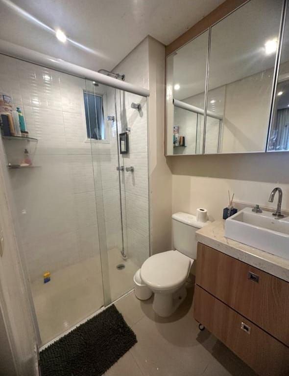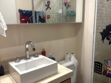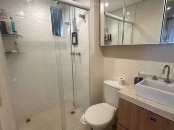Terraço gourmet envidraçado e persianas blackout, banheiros com box de vidro, armários, espelhos.