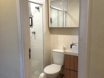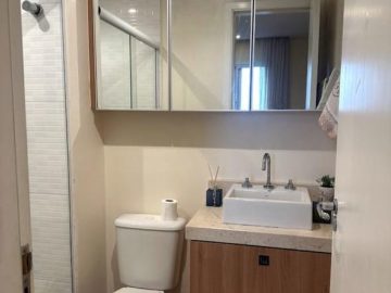 Gabinetes, parte do box com revestimento diferenciado, pias em cuba sobreposta, dormitórios com planejados, piso laminado.