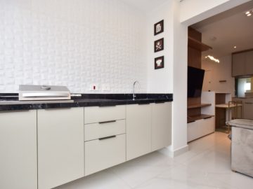 Varanda Gourmet com churrasqueira, 2 dormitórios com ar-condicionado sendo uma suíte e um quarto home-office que pode ser adaptado para quarto de criança, 2 banheiros e sala ampliada.