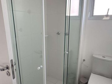 Piso laminado, banheiro com box de vidro.