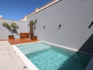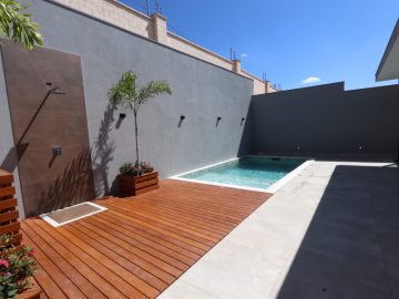 Piscina revestida em pastilhas de porcelana, com aquecimento solar, trocador de calor trifásico Sodramar, tratamento por ozônio Panozon, iluminação e hidromassagem.