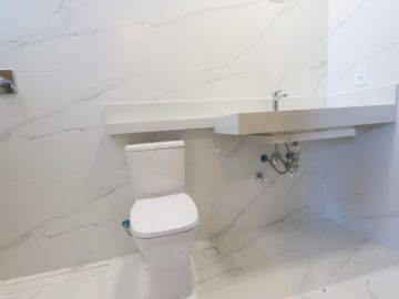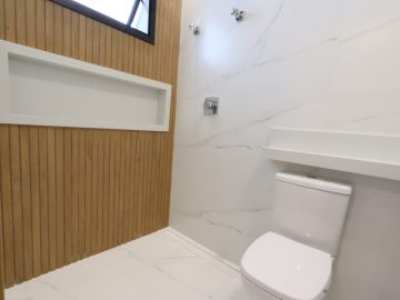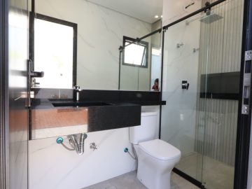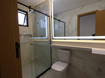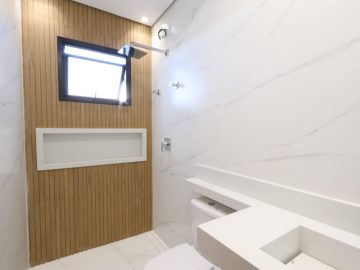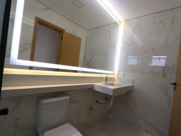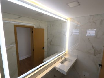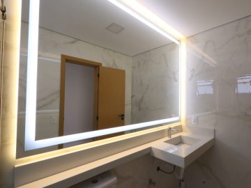 Torneiras monocomando, duchas de alta pressão e iluminação planejada.