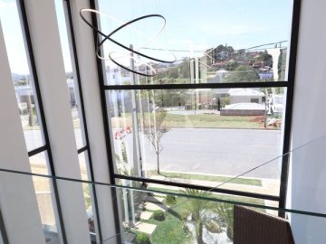Hall de entrada em pele de vidro, com pé-direito duplo e guarda-corpo em vidro.