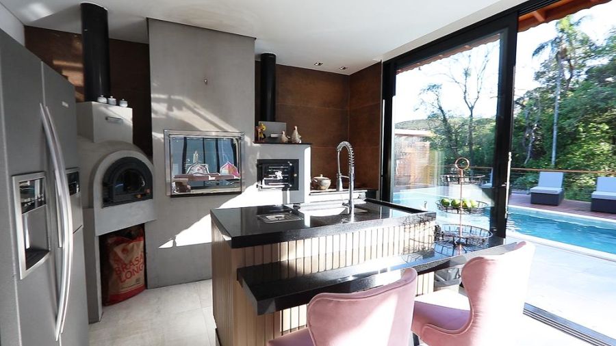 Espaço gourmet completo com churrasqueira, forno e fogão a lenha e forno de pizza.
