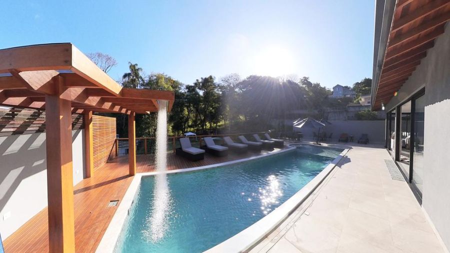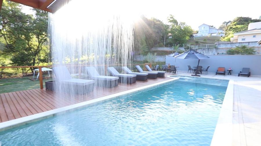 Piscina aquecida com cascata e hidromassagem.