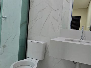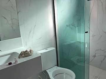 Os banheiros possuem revestimento até o teto e pia esculpida em branco prime.