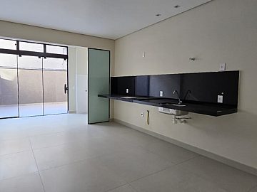 Cozinha com área gourmet conjugada com porcelanato, pia em granito preto negresco.