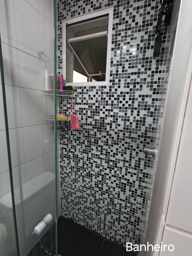 Banheiro com box de vidro, sacada.