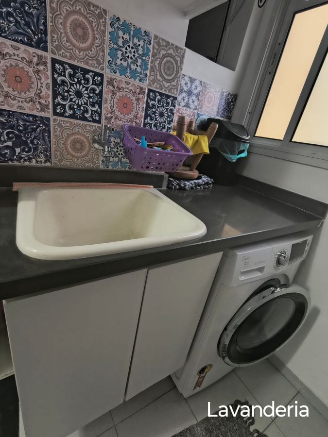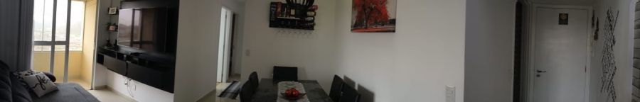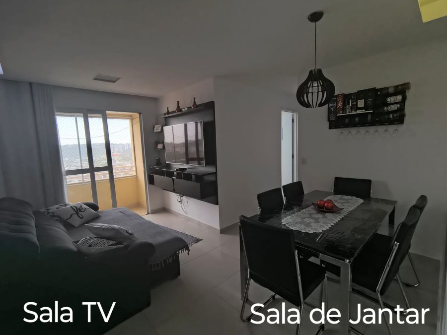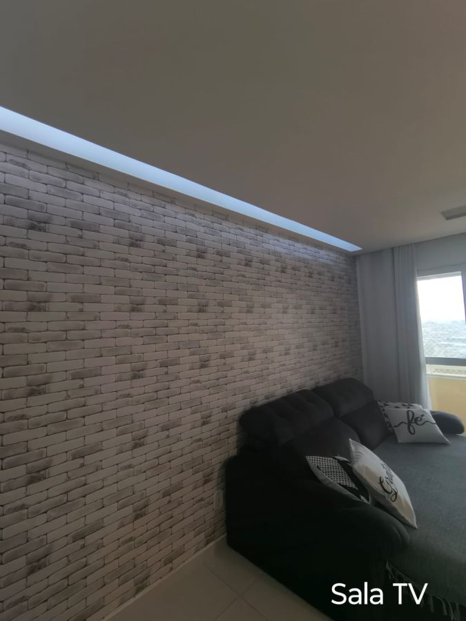 Sala para 2 ambientes com painel, área de serviço.