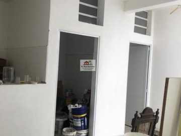 Salão, banheiro, lavanderia área coberta com pia e quintal aberto.